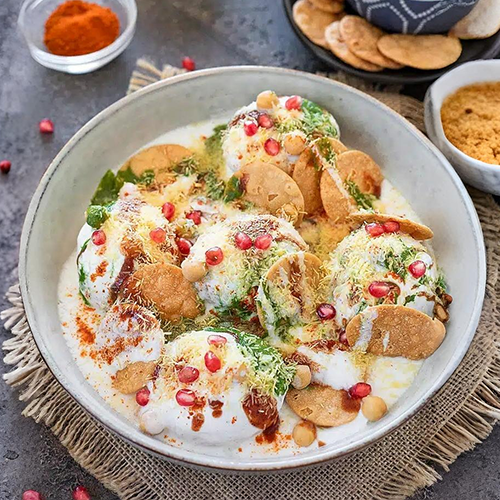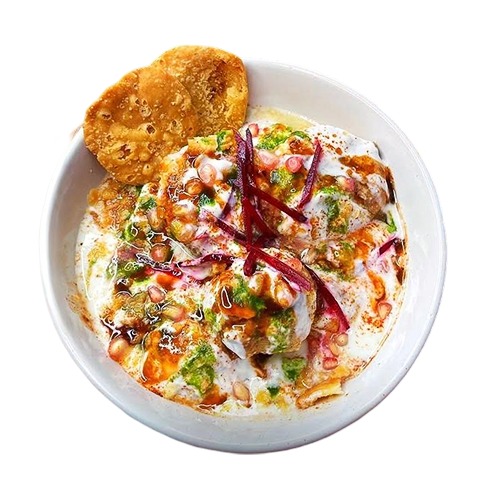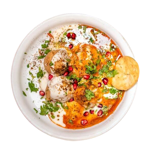 (2 Lentil balls served with drizzled tamarind and mint chutney with yogurt as a base and garnished with crushed savoury patties)