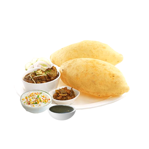 (2 Deep fried bhature served with chickpeas gravy, drizzled chutney on onions, pickle and raita)